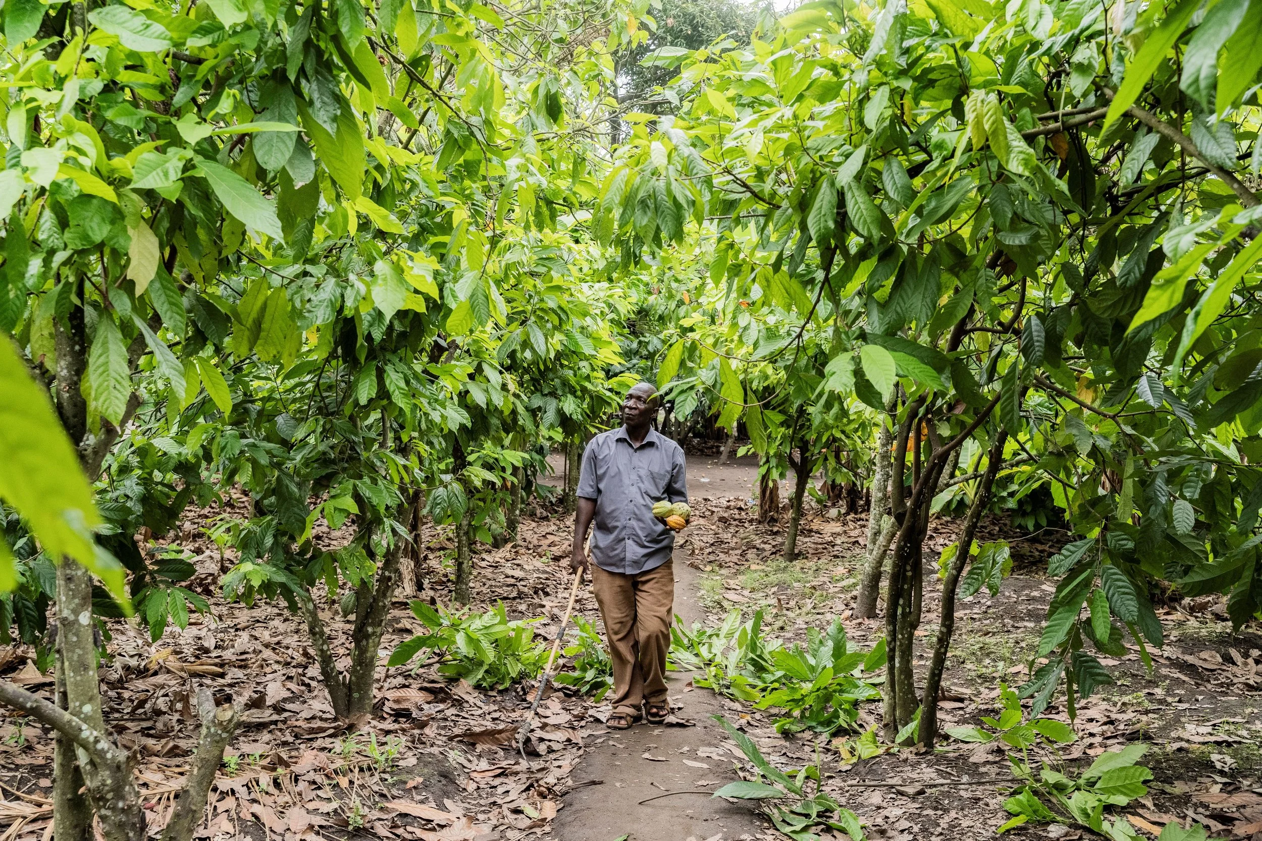 Aswile A Mangama walks on his farm holding ripe cocoa fruits, Mbeya Region, Tanzania.